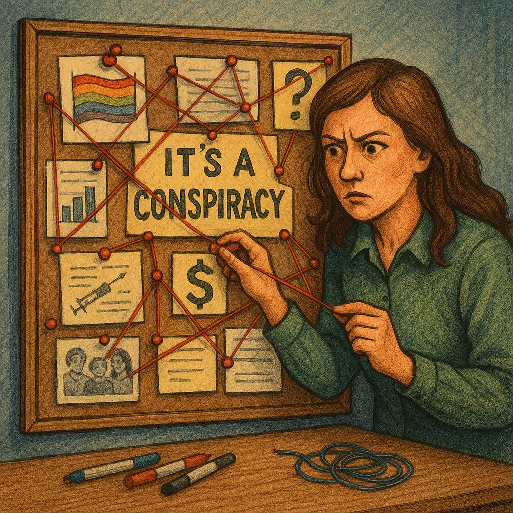 Holy conspiracy cork-board, Batman! Let’s dive into the latest rainbow panic bulletin from Penny Marie of Let Kids Be Kids. In her April post about the Rainbow Wellbeing Legacy Fund, Penny rebrands mental health support as a “manufactured crisis”, state funding as a sinister plot, and affirming care as indoctrination and mutilation. It’s a conspiracy classic: selective outrage, invented villains, and total amnesia around history, research data, and the law.