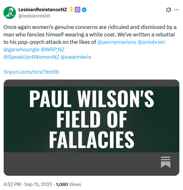 A rebuttal of my work was published (archived) last year by "Lesbian Resistance." It critiques a series of four articles I wrote, occasioned by my recent analysis of patterns in responses to the Law Commission's Ia Tangata report and references three earlier articles responding to content by Hamish McGregor, Jan Rivers, and Penny Marie.